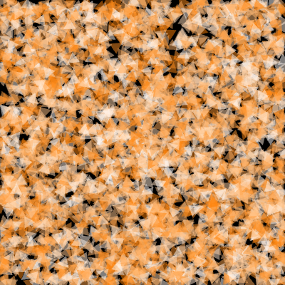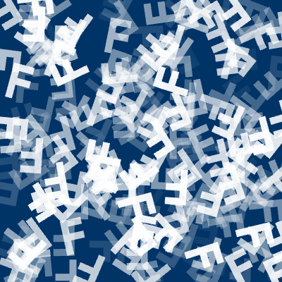 一応、エレメント描画でインスタンシングをやる例も挙げておきます。内容としては、前回描画した「F」の字を位置や回転スピードをずらして複製するものです。256個です。「F」の描画にはそれなりに多い枚数の三角形のデータが必要で。大量にまとめて描画しようとするとドローコールをたくさん実行するか、大きなサイズのジオメトリが必要になってきます。でもインスタンシングなら1個分かつたった1回で済むので楽ちんです。それを見ます。