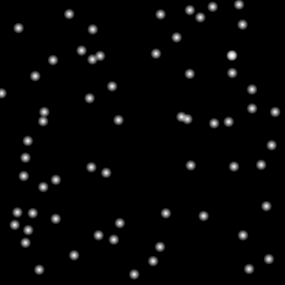 点描画です。64個のパーティクルを動かしています。位置を更新するのはどうしているかというと、実はこの程度なら動的更新でやった方が手っ取り早いです。しかし勉強のためにTFFで更新しています。まあ大変なんですが、学習なので...。